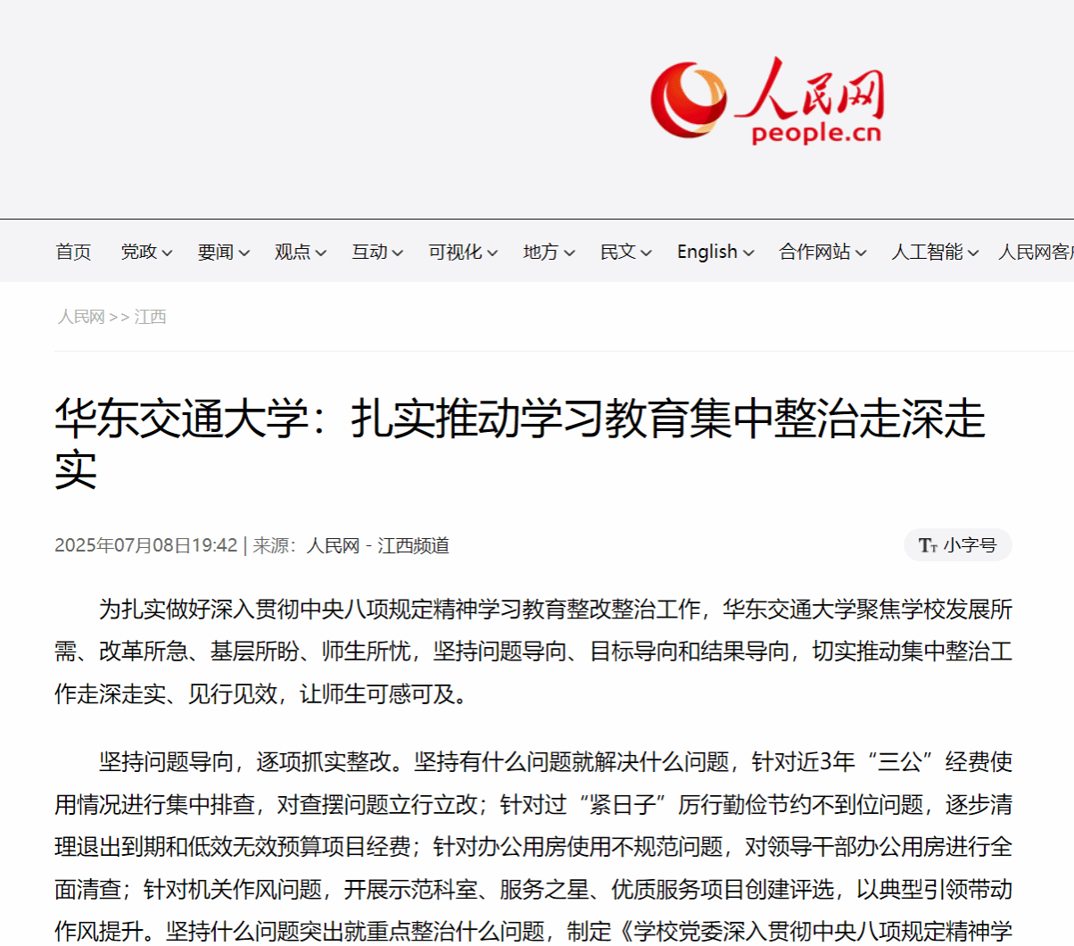 为扎实做好深入贯彻中央八项规定精神学习教育整改整治工作,华东交通大学聚焦学校发展所需、改革所急、基层所盼、师生所忧,坚持问题导向、目标导向和结果导向,切实推动集中整治工作走深走实、见行见效,让师生可感可及。