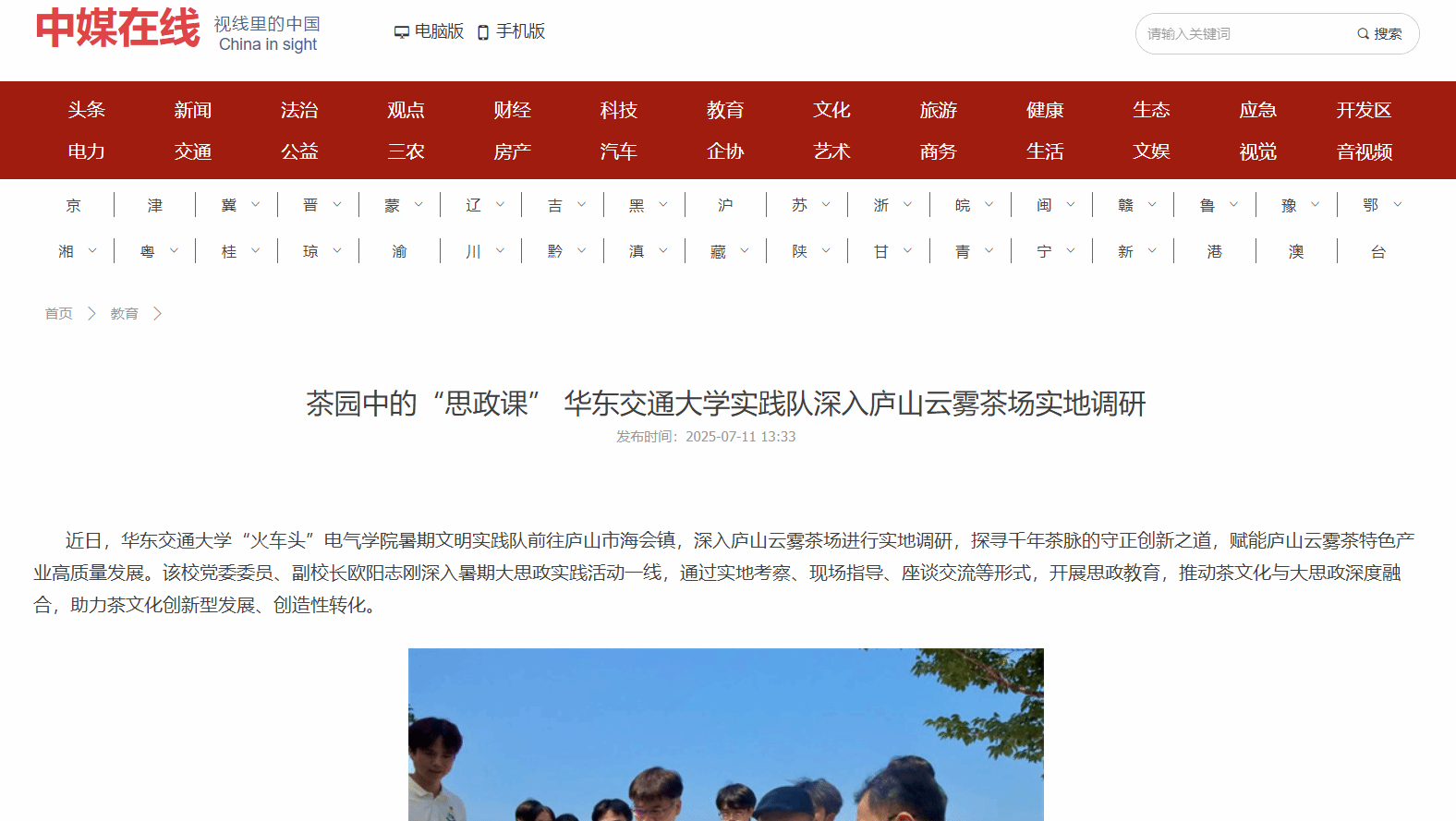 近日,华东交通大学“火车头”电气学院暑期文明实践队前往庐山市海会镇,深入庐山云雾茶场进行实地调研,探寻千年茶脉的守正创新之道,赋能庐山云雾茶特色产业高质量发展。该校党委委员、副校长欧阳志刚深入暑期大思政实践活动一线,通过实地考察、现场指导、座谈交流等形式,开展思政教育,推动茶文化与大思政深度融合,助力茶文化创新型发展、创造性转化。