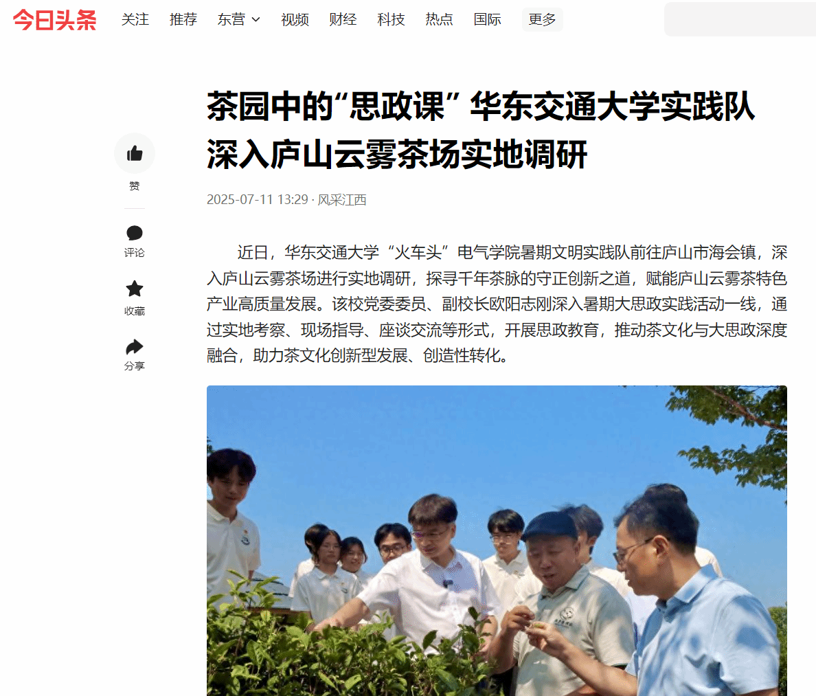 近日,华东交通大学“火车头”电气学院暑期文明实践队前往庐山市海会镇,深入庐山云雾茶场进行实地调研,探寻千年茶脉的守正创新之道,赋能庐山云雾茶特色产业高质量发展。该校党委委员、副校长欧阳志刚深入暑期大思政实践活动一线,通过实地考察、现场指导、座谈交流等形式,开展思政教育,推动茶文化与大思政深度融合,助力茶文化创新型发展、创造性转化。