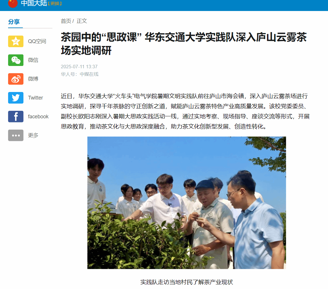 近日,华东交通大学“火车头”电气学院暑期文明实践队前往庐山市海会镇,深入庐山云雾茶场进行实地调研,探寻千年茶脉的守正创新之道,赋能庐山云雾茶特色产业高质量发展。该校党委委员、副校长欧阳志刚深入暑期大思政实践活动一线,通过实地考察、现场指导、座谈交流等形式,开展思政教育,推动茶文化与大思政深度融合,助力茶文化创新型发展、创造性转化。