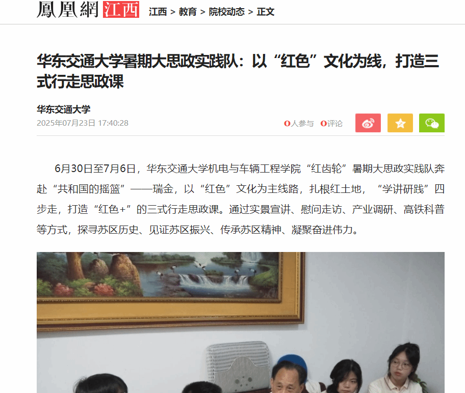 6月30日至7月6日,华东交通大学机电与车辆工程学院“红齿轮”暑期大思政实践队奔赴“共和国的摇篮”——瑞金,以“红色”文化为主线路,扎根红土地,“学讲研践”四步走,打造“红色+”的三式行走思政课。通过实景宣讲、慰问走访、产业调研、高铁科普等方式,探寻苏区历史、见证苏区振兴、传承苏区精神、凝聚奋进伟力。