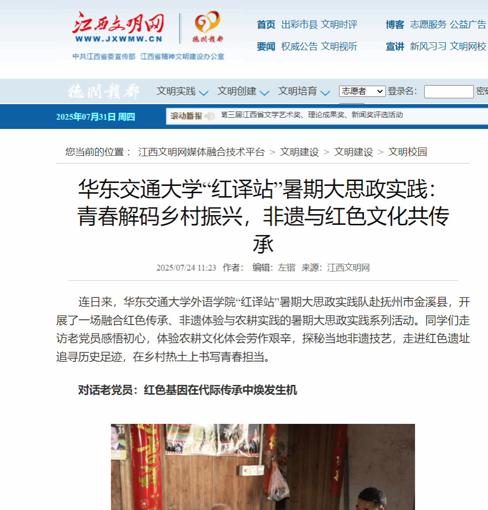连日来,华东交通大学外语学院“红译站”暑期大思政实践队赴抚州市金溪县,开展了一场融合红色传承、非遗体验与农耕实践的暑期大思政实践系列活动。同学们走访老党员感悟初心,体验农耕文化体会劳作艰辛,探秘当地非遗技艺,走进红色遗址追寻历史足迹,在乡村热土上书写青春担当。