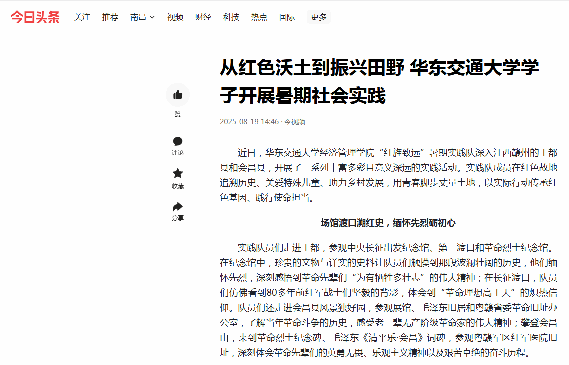 近日,华东交通大学经济管理学院“红旌致远”暑期实践队深入江西赣州的于都县和会昌县,开展了一系列丰富多彩且意义深远的实践活动。实践队成员在红色故地追溯历史、关爱特殊儿童、助力乡村发展,用青春脚步丈量土地,以实际行动传承红色基因、践行使命担当。