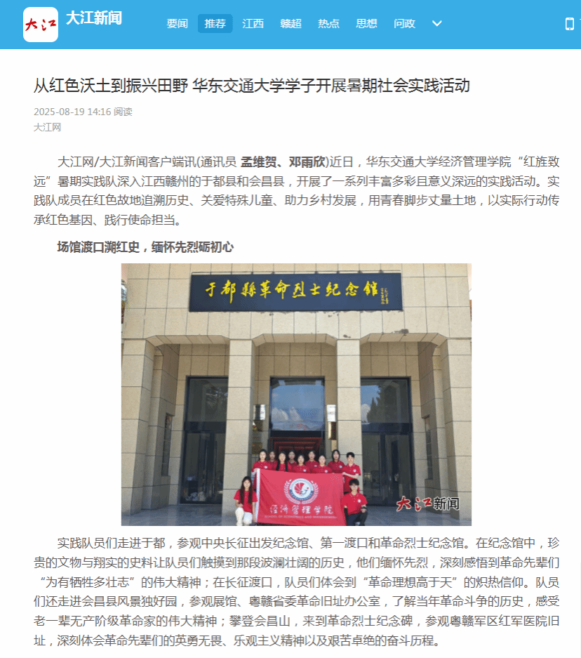 近日,华东交通大学经济管理学院“红旌致远”暑期实践队深入江西赣州的于都县和会昌县,开展了一系列丰富多彩且意义深远的实践活动。实践队成员在红色故地追溯历史、关爱特殊儿童、助力乡村发展,用青春脚步丈量土地,以实际行动传承红色基因、践行使命担当。