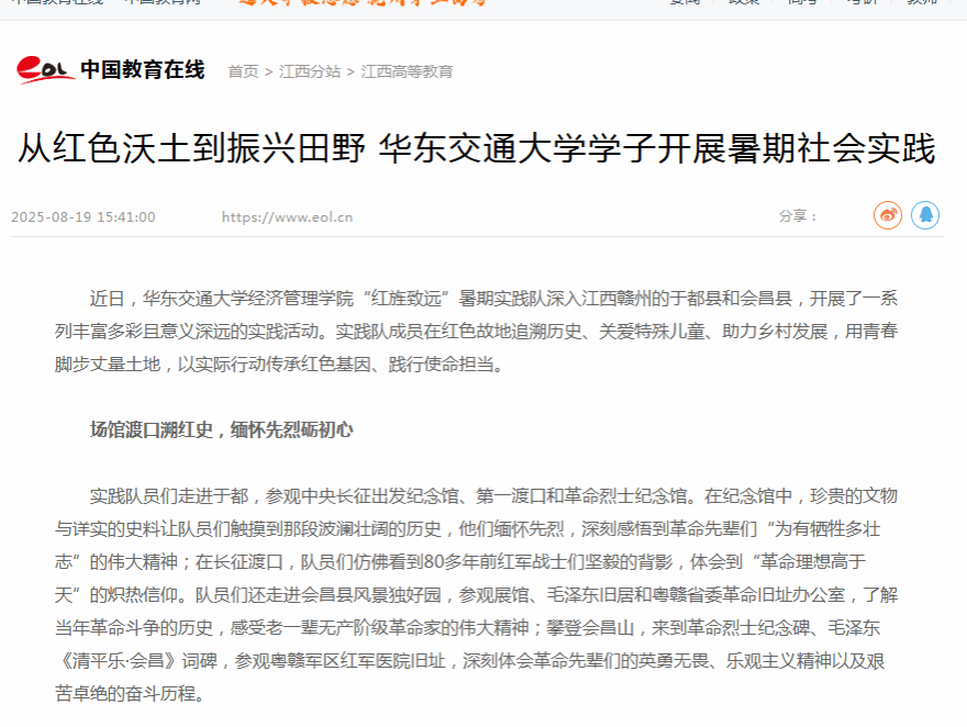 近日,华东交通大学经济管理学院“红旌致远”暑期实践队深入江西赣州的于都县和会昌县,开展了一系列丰富多彩且意义深远的实践活动。实践队成员在红色故地追溯历史、关爱特殊儿童、助力乡村发展,用青春脚步丈量土地,以实际行动传承红色基因、践行使命担当。