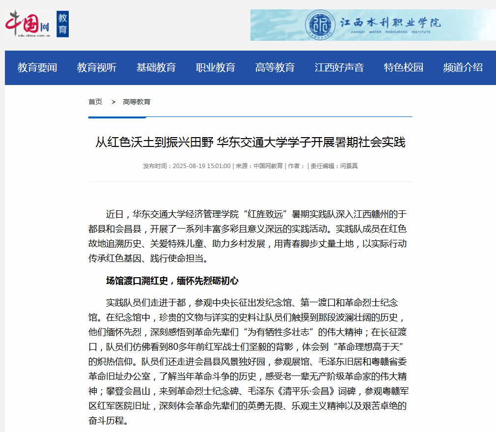 近日,华东交通大学经济管理学院“红旌致远”暑期实践队深入江西赣州的于都县和会昌县,开展了一系列丰富多彩且意义深远的实践活动。实践队成员在红色故地追溯历史、关爱特殊儿童、助力乡村发展,用青春脚步丈量土地,以实际行动传承红色基因、践行使命担当。