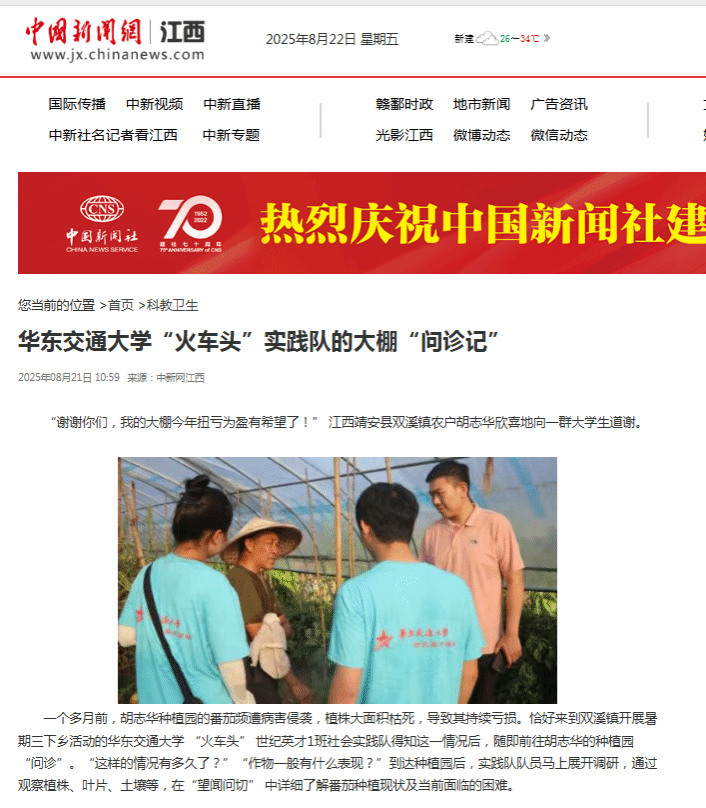 一个多月前,胡志华种植园的番茄频遭病害侵袭,植株大面积枯死,导致其持续亏损。恰好来到双溪镇开展暑期三下乡活动的华东交通大学 “火车头” 世纪英才1班社会实践队得知这一情况后,随即前往胡志华的种植园 “问诊”。“这样的情况有多久了?”“作物一般有什么表现?”到达种植园后,实践队队员马上展开调研,通过观察植株、叶片、土壤等,在“望闻问切” 中详细了解番茄种植现状及当前面临的困难。