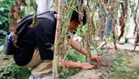 一个多月前,胡志华种植园的番茄频遭病害侵袭,植株大面积枯死,导致其持续亏损。恰好来到双溪镇开展暑期三下乡活动的华东交通大学 “火车头” 世纪英才1班社会实践队得知这一情况后,随即前往胡志华的种植园 “问诊”。 “这样的情况有多久了?”“作物一般有什么表现?” 到达种植园后,实践队队员马上展开调研,通过观察植株、叶片、土壤等,在 “望闻问切” 中详细了解番茄种植现状及当前面临的困难。