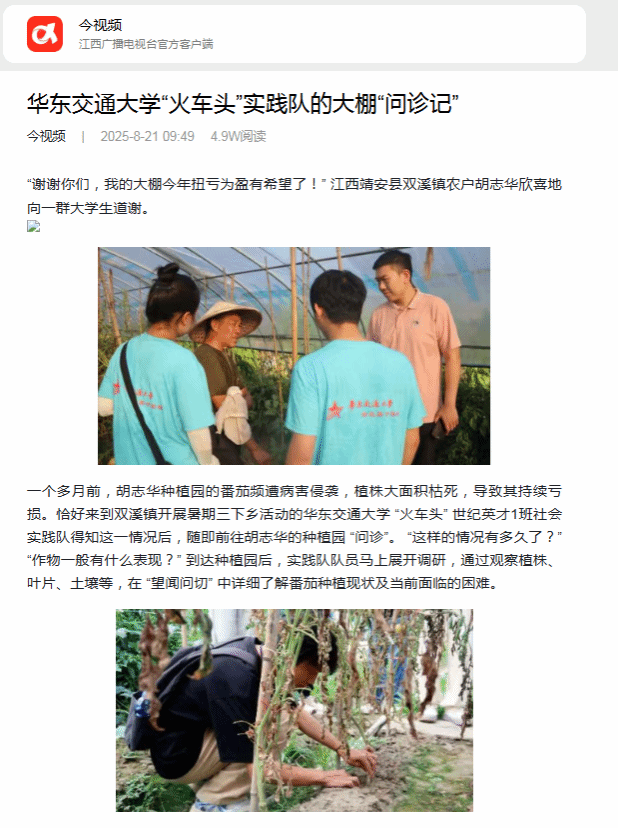 “谢谢你们,我的大棚今年扭亏为盈有希望了!” 江西靖安县双溪镇农户胡志华欣喜地向一群大学生道谢。