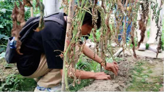 经过细致“问诊”,实践队初步判断,番茄植株正遭受毒蛾等病虫害和枯叶病等细菌性植物疾病的侵害。队员们细心采集病害植株样本,代为送至专业机构检查。在确诊病害系番茄细菌性枯萎病与毒蛾幼虫侵害叠加所致后,团队迅速制定 “生物防治 + 科学管理” 的综合解决方案。一个月后,实践队偕同校 “益番丰顺” 科研团队骨干成员重返胡志华的番茄种植园,带来“助农处方”——高效低毒生物农药,以精准控制毒蛾虫口密度。