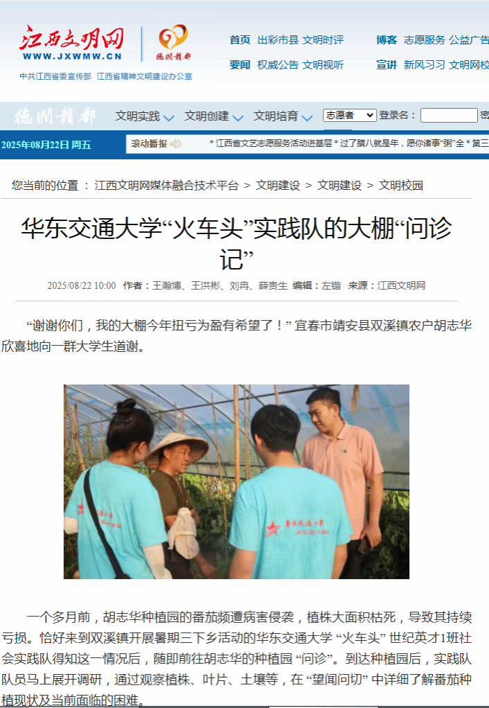 “谢谢你们,我的大棚今年扭亏为盈有希望了!” 宜春市靖安县双溪镇农户胡志华欣喜地向一群大学生道谢。