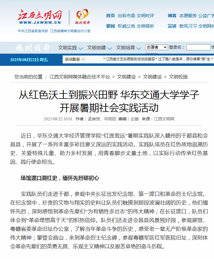 近日,华东交通大学经济管理学院“红旌致远”暑期实践队深入赣州的于都县和会昌县,开展了一系列丰富多彩且意义深远的实践活动。实践队成员在红色故地追溯历史、关爱特殊儿童、助力乡村发展,用青春脚步丈量土地,以实际行动传承红色基因、践行使命担当。