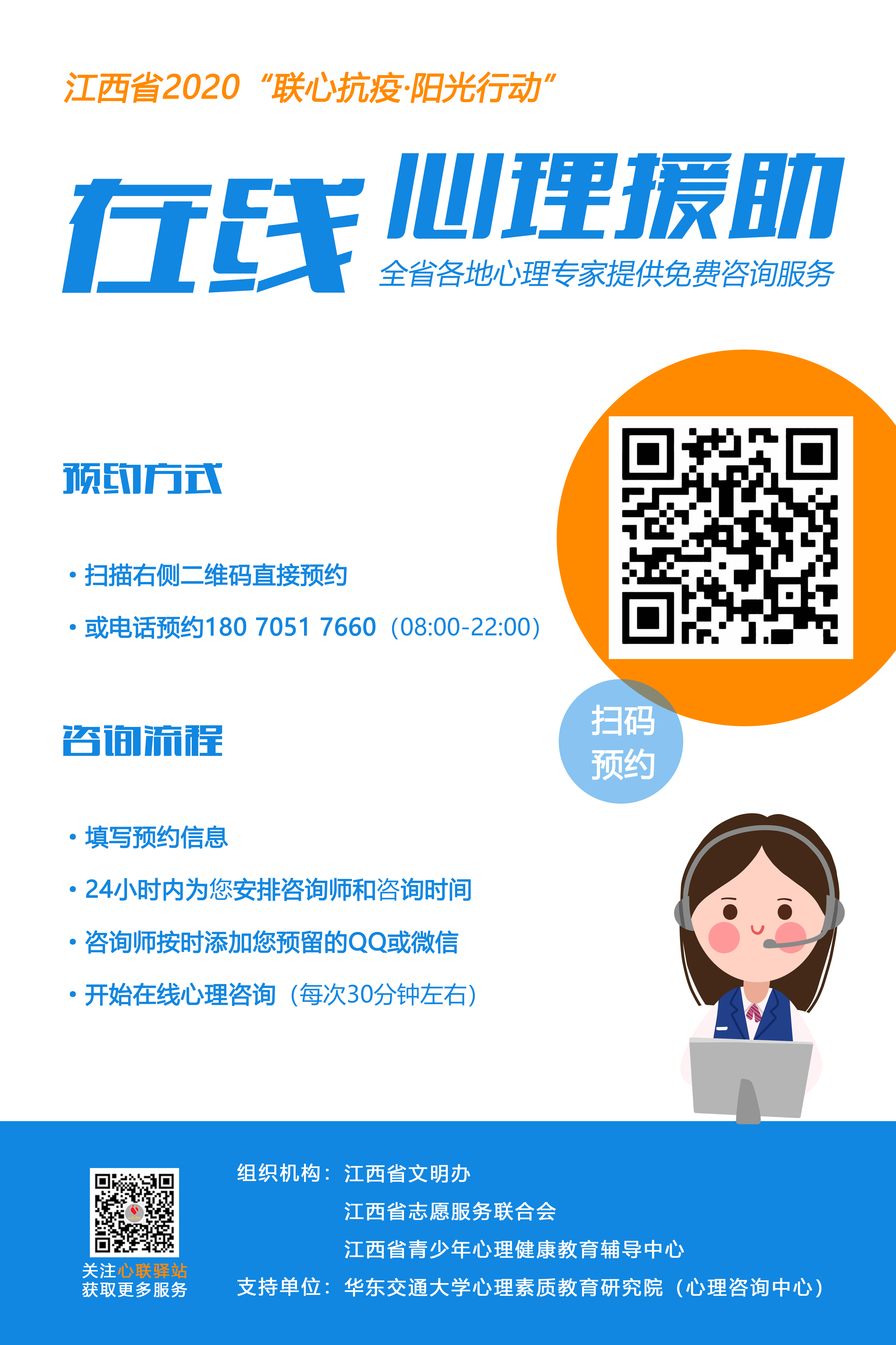 假如您有此类问题,请识别下方二维码或拨打热线电话(18070517660,8:00-22:00)填写或告之个人背景信息及大致要咨询的问题,后台人员24小时内进行咨询师匹配,省青少年心理辅导中心安排心理专业志愿者加您QQ或微信,然后通过线上语音沟通的为您提供心理支持。