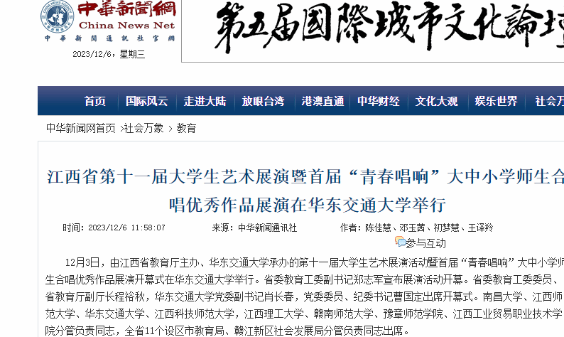 12月3日,由江西省教育厅主办、华东交通大学承办的第十一届大学生艺术展演活动暨首届“青春唱响”大中小学师生合唱优秀作品展演开幕式在华东交通大学举行。省委教育工委副书记郑志军宣布展演活动开幕。省委教育工委委员、省教育厅副厅长程裕秋,华东交通大学党委副书记肖长春,党委委员、纪委书记曹国定出席开幕式。南昌大学、江西师范大学、华东交通大学、江西科技师范大学,江西理工大学、赣南师范大学、豫章师范学院、江西工业贸易职业技术学院分管负责同志,全省11个设区市教育局、赣江新区社会发展局分管负责同志出席。
