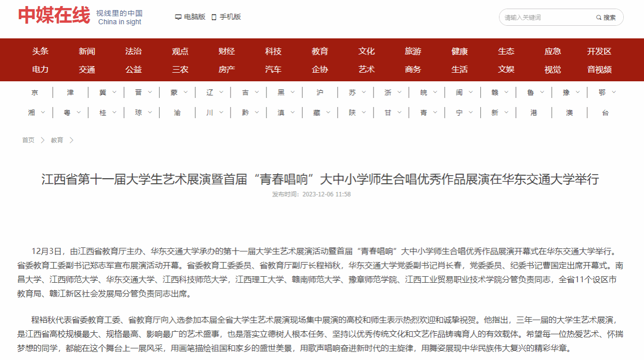 12月3日,由江西省教育厅主办、华东交通大学承办的第十一届大学生艺术展演活动暨首届“青春唱响”大中小学师生合唱优秀作品展演开幕式在华东交通大学举行。省委教育工委副书记郑志军宣布展演活动开幕。省委教育工委委员、省教育厅副厅长程裕秋,华东交通大学党委副书记肖长春,党委委员、纪委书记曹国定出席开幕式。南昌大学、江西师范大学、华东交通大学、江西科技师范大学,江西理工大学、赣南师范大学、豫章师范学院、江西工业贸易职业技术学院分管负责同志,全省11个设区市教育局、赣江新区社会发展局分管负责同志出席。